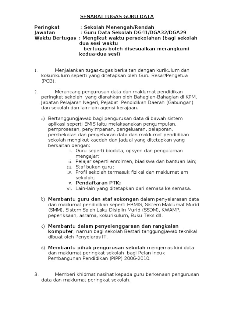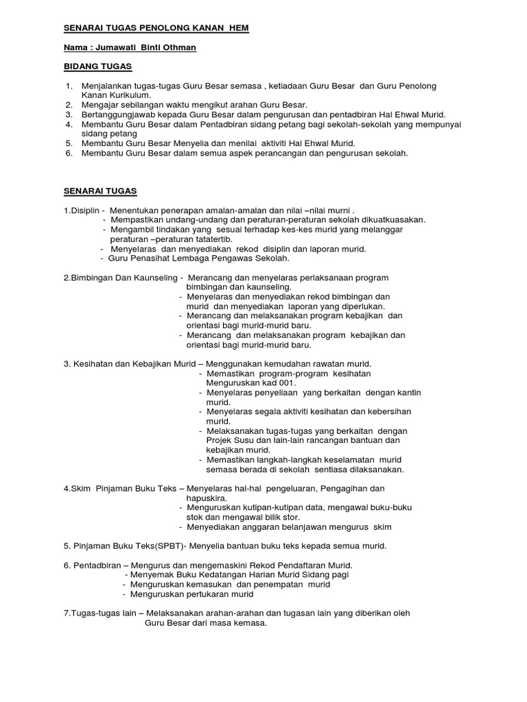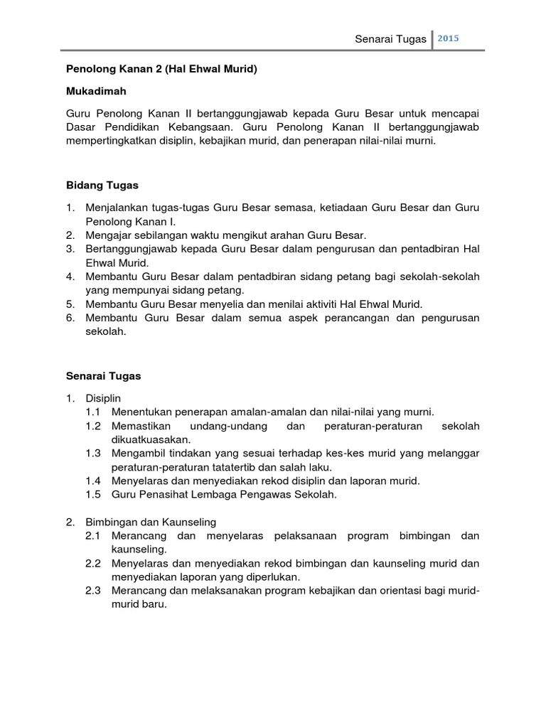 Guru bertugas harian / mingguan dan guru kelas. Mengadakan perbincangan dengan ibu bapa atau penjaga murid yang mempunyai masalah disiplin menyampaikan laporan tentang pelajar baru kepada guru besar. Savesave senarai tugas guru besar1 for later. Senarai tugas guru besar siri 1. oleh guru kelas atau guru matapelajaran.
