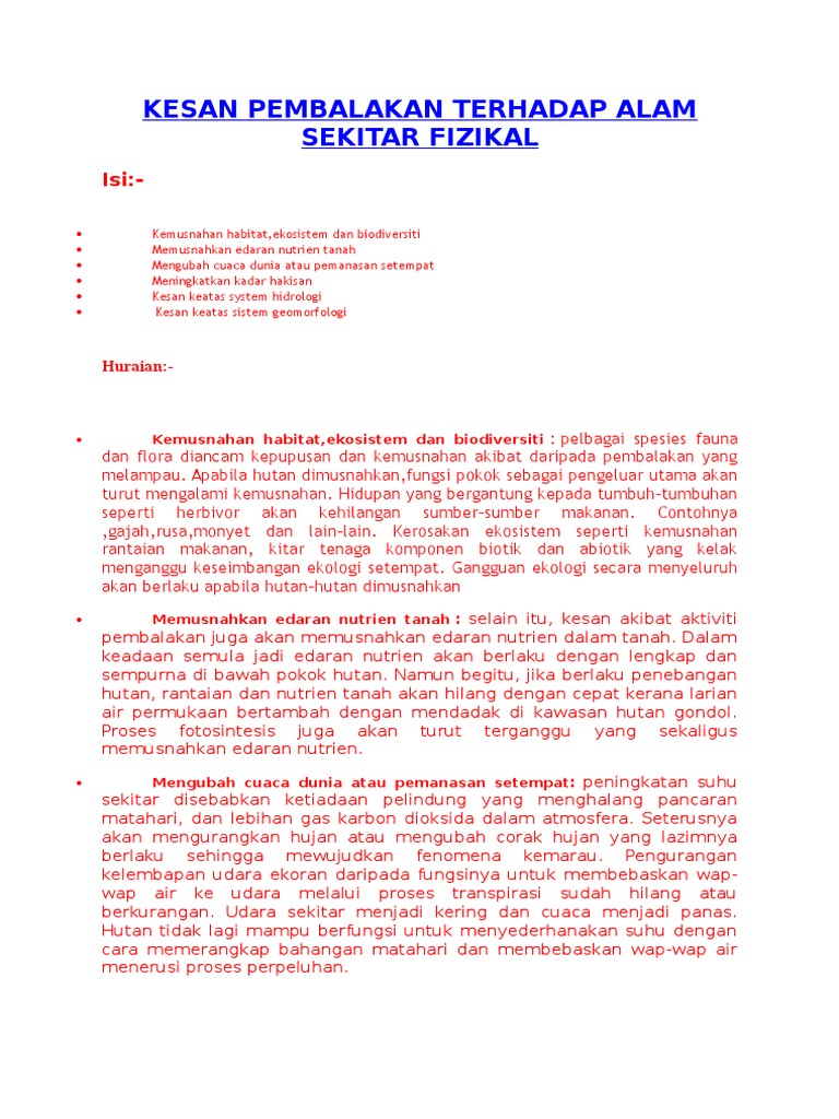 Berikut dikongsikan adalah maklumat tentang kesan guna tanah terhadap alam sekitar mengikut jenis guna tanah aktiviti pertanian boleh memberi kesan negatif kepada alam sekitar adalah iaitu : Setiap manusia menyumbang terhadap kemusnahan alam sekitar. Kegiatan perindustrian kilang melepaskan gas,debu,dan asap mencemarkan udara. Punca penebangan hutan untuk kawasan pertanian, perindustrian dan pelancongan kawasan hutan berubah menjadi kawasan tanaman, kilang dan petempatan pembinaan infrastruktur. Manusia akan menghidap pelbagai penyakit, khususnya respirasi akibat menghidu udara yang tercemar. Pencemaran alam sekitar telah memberi kesan yang buruk terhadap hidupan di dunia pada masa kini. Konklusinya, pelbagai kesan yang buruk akan dan telah pun berlaku terhadap alam sekitar akibat pemanasan global. Kesan pembandaran terhadap alam sekitar. 5) kesan perikanan terhadap alam sekitar. Kesan pencemaran udara ke atas alam sekitar ekologi alam • kesan utama pencemaran udara adalah ke atas kesihatan manusia. 2.pembuangan sampah sarap dan sisa toksik ke dalam kolam rawatan. Senarai impak petempatan pertanian perniagaan dan kesan guna tanah terhadap alam sekitar kursus geografi pt3 berdasarkan kajian. Di antara kesan utama yang menimpa manusia akibat daripada pencemaran udara ialah terhadap sistem pernafasan.